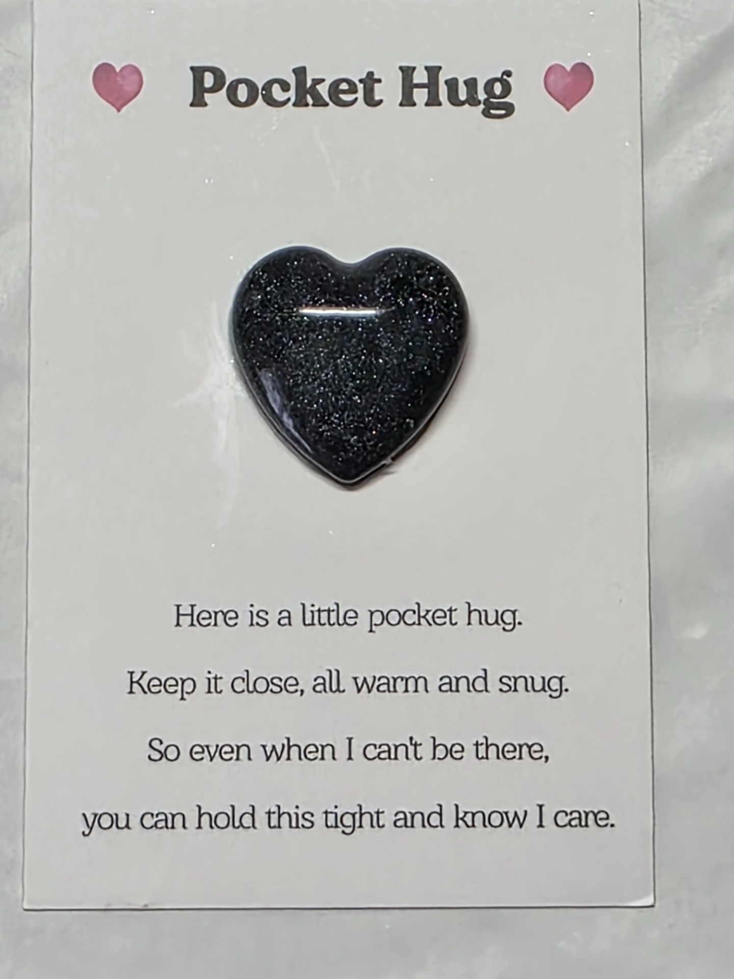 Here is a little pocket hug. Keep it close, all warm and snug. So even when I can't be there, you can hold this tight and know I care.