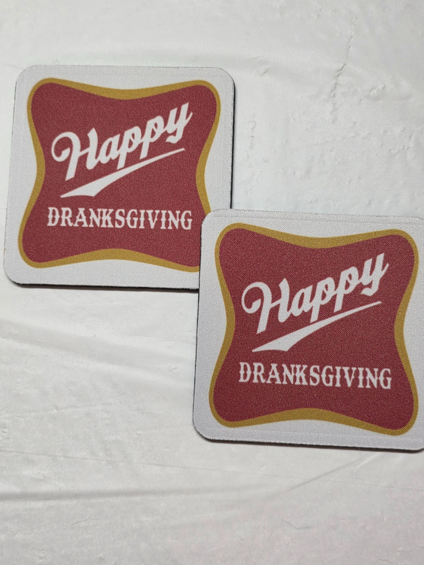 These are made with sublimation blank coaster and sublimation ink. The back is rubber, so they don't slide around.
