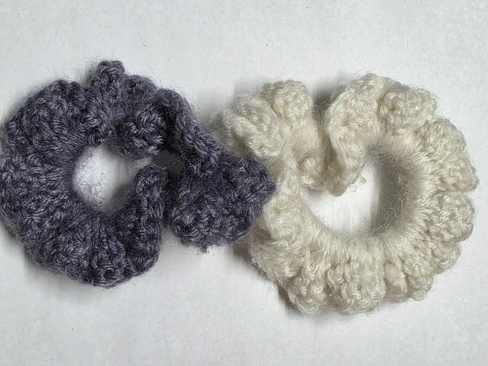 These are made of 100% acrylic yarn. This is an attached double scrunchy.