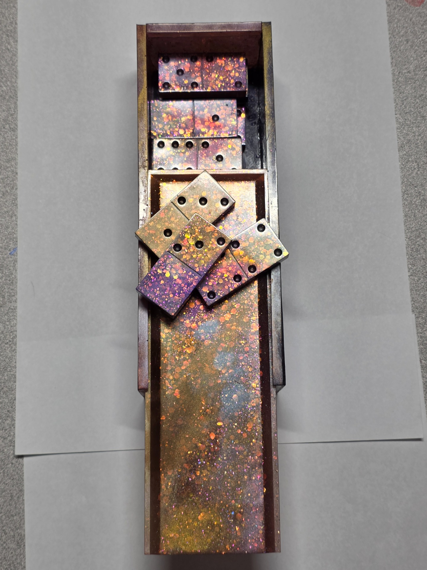These are a double six set of dominoes. The are made of resin, glitter and mica powder.