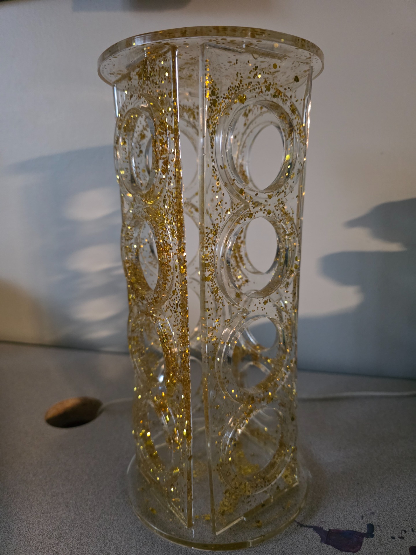 This is made of resin and glitter. There is 16 holes for those favorite Keurig coffee pods. It spins so you can make your choice of a coffee pod easier, or you can turn it around where it stands still.