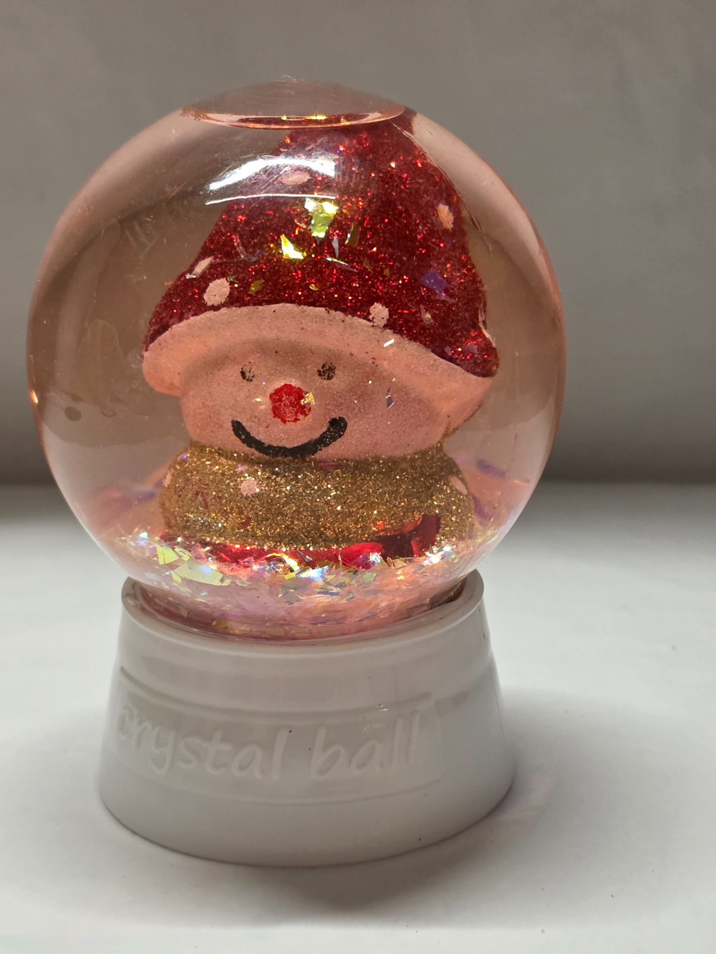 These are plastic snow globes. They are made with water, clear glue, faux snow and figurines. Shake and enjoy. They stand 4.25 inches. The red color is from the figurine.