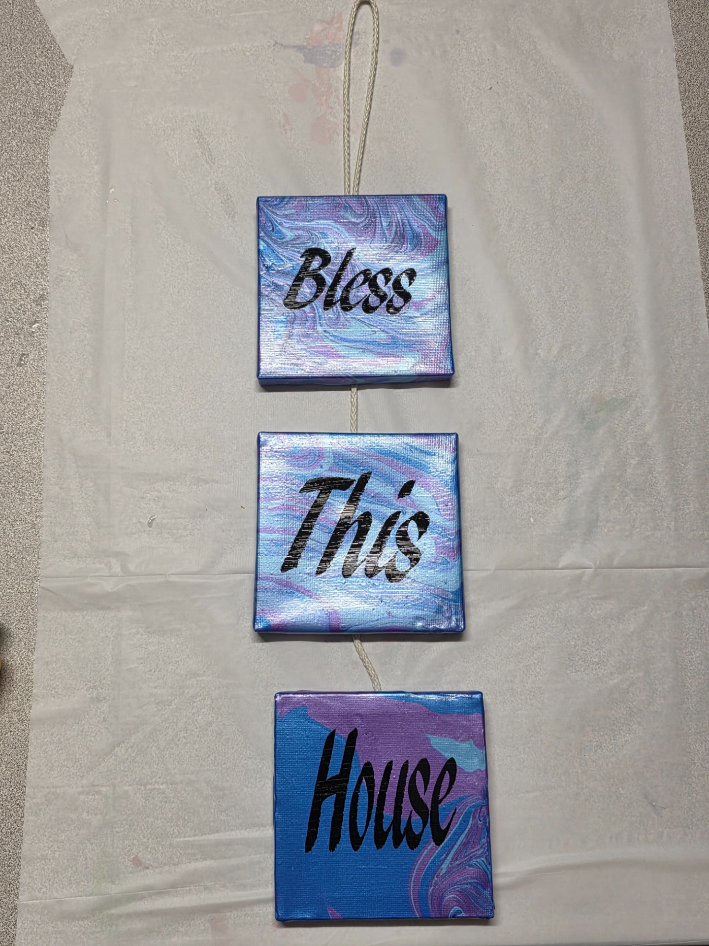 These are great for the walls in any room. Each piece is 3.5 x 3.5. They are made with canvas, acrylic paint, rope, and vinyl.